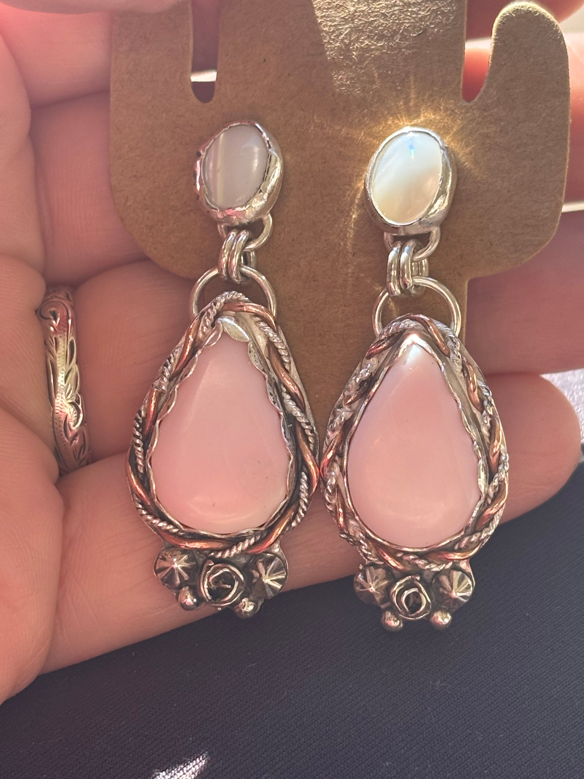 Pink conch and fresh water pearl in a handmade sterling silver setting. Accented with hand twisted copper sterling border and handmade details!